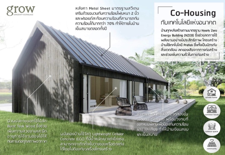 Co-housing ภายใต้ Grow Longevity Ecovillage คือหมู่บ้านต้นแบบเพื่อการอยู่อาศัยสำหรับ “วิถีชีวิตสุขยืนยาว” ที่ผสานการอยู่อาศัยแบบ บ้านส่วนตัว เข้ากับ พื้นที่ส่วนกลางคุณภาพ อย่างสมดุล เกิดเป็นชุมชนที่ออกแบบระบบการอยู่ร่วมกันอย่างปลอดภัย อบอุ่น และส่งเสริมสุขภาพทั้งในระดับพฤติกรรมและสภาพแวดล้อม ภายในโครงการประกอบด้วย Community Hub ครัวและเวิร์กช็อปส่วนรวม สวนและฟาร์ม รวมถึงกิจกรรมชุมชนที่เชื่อมโยงผู้คนเข้าหากัน โดยใช้แนวคิด Human-Centric Wellness Architecture และ age-proof design เพื่อรองรับการใช้ชีวิตระยะยาว ลดความโดดเดี่ยว เสริมสร้างความปลอดภัย เป้าหมายชีวิต และความสัมพันธ์ระหว่างผู้คน เอื้อให้ทุกคนอยู่ดี มีสุข และเติบโตไปพร้อมกันอย่างยั่งยืน ระบบบ้านอัจฉริยะเพื่อการอยู่อาศัยอย่างยั่งยืน (Smart & Healthy Living System) Grow Longevity Ecovillage ประกอบด้วยรูปแบบบ้าน 2 รูปแบบ โดยแบ่งตามขนาดของพื้นที่การใช้สอบ ได้แก่ 45 ตร.ม. และ 85 ตร.ม. โดยบ้านทุกหลังได้รับการออกแบบภายใต้แนวคิด Near Zero Energy Building (nZEB) และ Human-Centric Wellness Architecture เพื่อให้บ้านไม่ใช่แค่ที่อยู่อาศัย แต่เป็น “ระบบสนับสนุนสุขภาพ” ที่ทำงานร่วมกับผู้อยู่อาศัยตลอดชีวิต