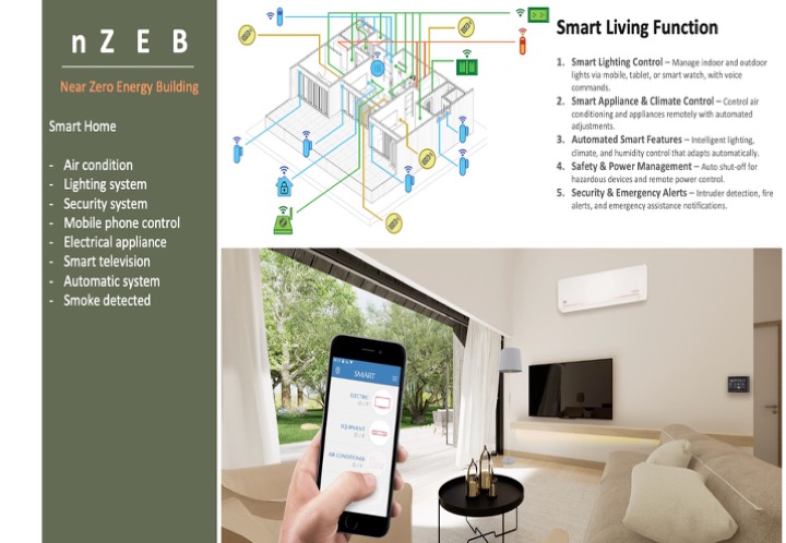 2. ระบบควบคุมอากาศและเครื่องใช้ไฟฟ้า (Smart Climate & Devices Control) ระบบปรับอากาศถูกออกแบบให้ทำงานอย่างมีประสิทธิภาพ ควบคุมอุณหภูมิและทิศทางลมอย่างเหมาะสม พร้อมระบบควบคุมเครื่องใช้ไฟฟ้าอัจฉริยะ ช่วยลดการใช้พลังงานโดยไม่ลดคุณภาพการอยู่อาศัย รองรับการควบคุมผ่านแอปพลิเคชัน